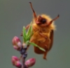 Description: A bee approaches a flower, legs extended, tongue out, and ready for action.